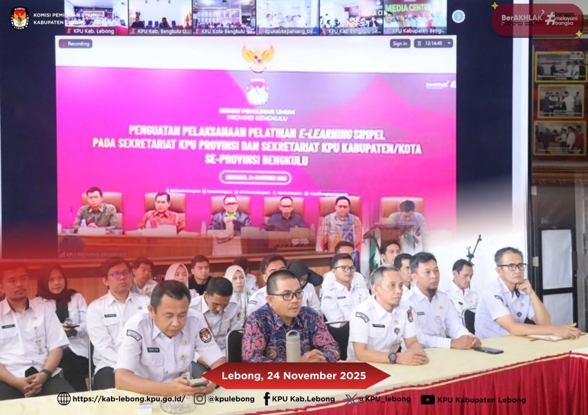 Lebong, 24 November 2025 - #temanpemilih, Komisi Pemilihan Umum (KPU) Kabupaten Lebong mengikuti kegiatan webinar yang diselenggarakan oleh KPU Provinsi Bengkulu pada Senin (24/11/2025). Webinar ini mengangkat tema yaitu Penguatan Pelaksanaan Pelatihan E-Learning SiMPEL pada Sekretariat KPU Provinsi dan Sekretariat KPU Kabupaten/Kota se-Provinsi Bengkulu. Kegiatan ini diikuti oleh Ketua KPU Kabupaten Lebong Yoki Setiawan, Sekretaris, Kasubbag, serta seluruh jajaran staff KPU Kapubaten Lebong. Dengan adanya webinar ini diharapkan para pegawai dapat disiplin dalam meningkatkan kompetensinya secara mandiri melalui sistem belajar digital yang telah disediakan pada SiMPEL. Sehingga dapat meningkatkan mutu dan kualitas layanan bagi masyarakat. (dmw) #KPUMelayani ....