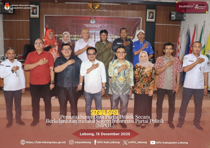 Lebong, 15 Desember 2025 - #TemanPemilih, Komisi Pemilihan Umum (KPU) Kabupaten Lebong melaksanakan kegiatan Sosialisasi Pemutakhiran Data Partai Politik Secara Berkelanjutan Melalui Sistem Informasi Partai Politik (SIPOL), pada Senin (15 Desember 2025) di Aula Kantor KPU Kabupaten Lebong. Kegiatan sosialisasi ini bertujuan untuk memastikan agar partai politik senantiasa melakukan pengkinian terhadap data kepengurusan, keanggotaan, serta kantor secara real-time dan berkala. Sehingga diharapkan adanya peningkatan transparansi dan akuntabilitas kepada publik. Hal ini akan memudahkan stake holder kepemiluan untuk melakukan verifikasi partai politik pada saat Pemilu. Hadir dalam kegiatan ini adalah Ketua, Anggota, dan Sekretaris KPU Kabupaten Lebong, serta beberapa tamu undangan seperti Bawaslu Kabupaten Lebong dan beberapa Partai Politik yang ada di Kabupaten Lebong. (dmw) #KPUMelayani ....