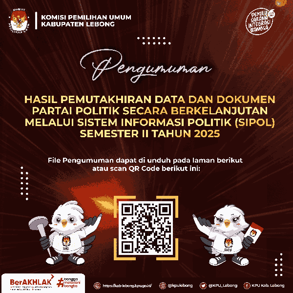 PENGUMUMAN NOMOR: 1/PL.01-Pu/1707/2026 TENTANG HASIL PEMUTAKHIRAN DATA DAN DOKUMEN PARTAI POLITIK SECARA BERKELANJUTAN MELALUI SIPOL SEMESTER II TAHUN 2025 Pengumuman selengkapnya dapat diunduh pada link berikut: Hasil Pemutakhiran Data dan Dokumen Parpol Semester II Tahun 2025 ....