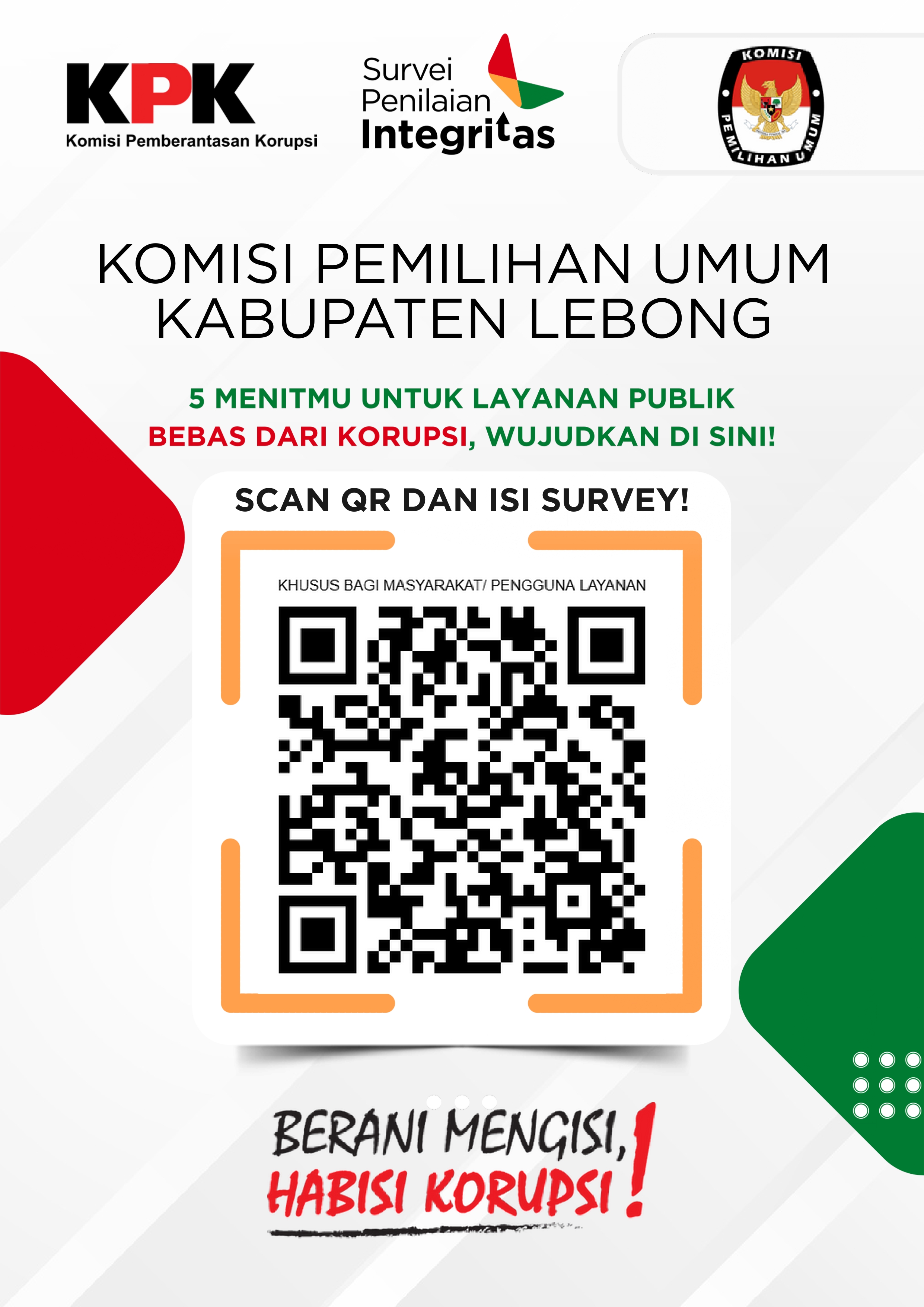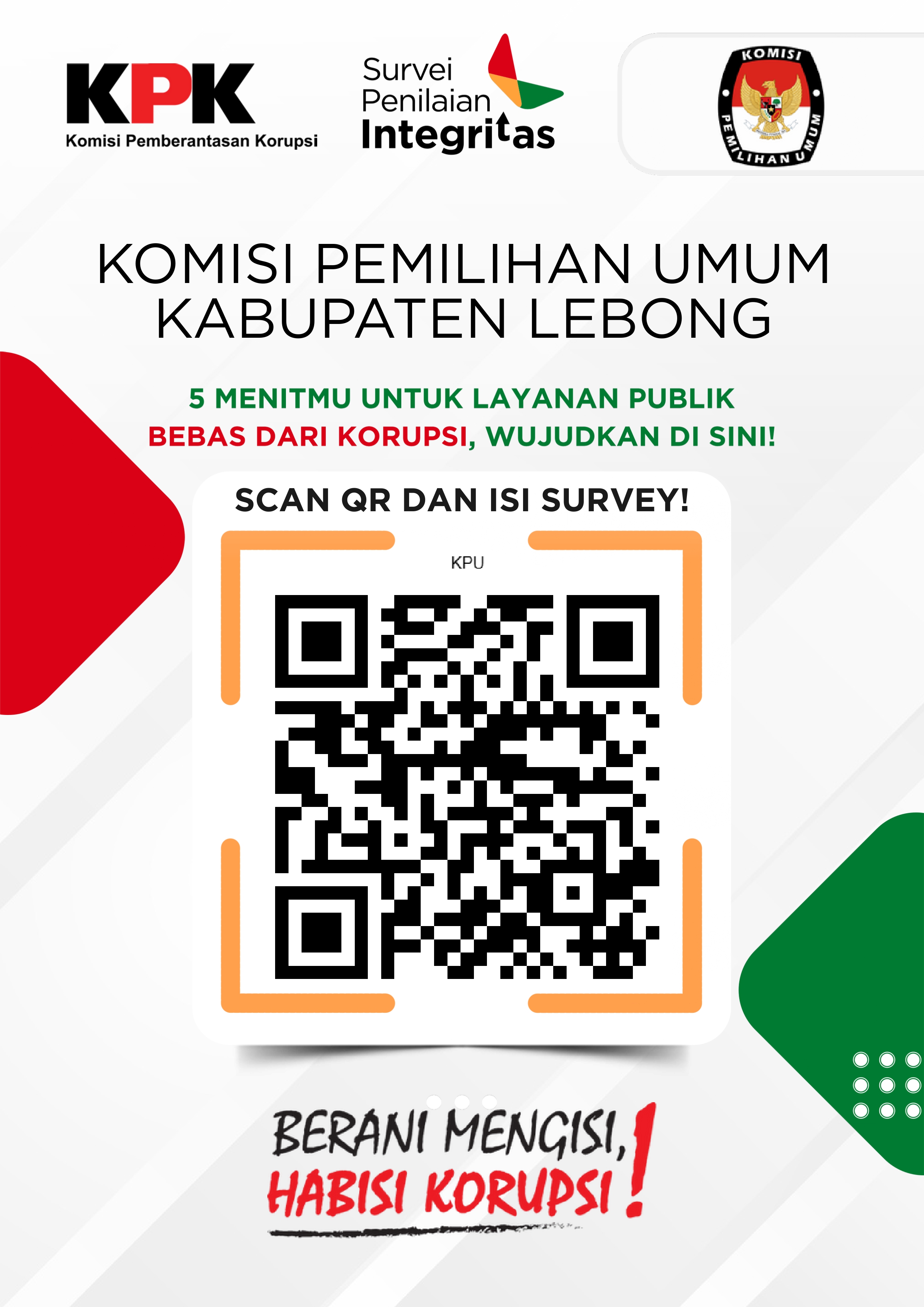 Lebong, 21/10/2025 - Dalam rangka meningkatkan kesadaran resiko korupsi dan perbaikan sistem anti korupsi di tubuh birokrasi Indonesia, Komisi Pemilihan Umum Republik Indonesia (KPU RI) secara umum dan KPU Kabupaten Lebong secara khusus mendukung program Survei Penilaian Integritas (SPI) yang dilakukan oleh Komisi Pemberantasan Korupsi (KPK). Oleh karena itu diharapkan partisipasi aktif dari Bapak/Ibu untuk mendaftarkan diri sebagai calon responden dengan mengisi kuesioner pada barcode berikut ini.
