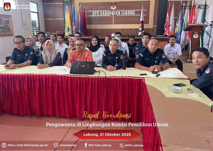 Lebong, 22 Oktober 2025 - #TemanPemilih, Komisi Pemilihan Umum (KPU) Kabupaten Lebong mengikuti Rapat Koordinasi Hasil Pengawasan di Lingkungan KPU yang diselenggarakan oleh KPU RI secara daring (21 Oktober 2025). Kegiatan ini melibatkan narasumber eksternal mulai dari Badan Pemeriksa Keuangan (BPK), Badan Pengawasan Keuangan dan Pembangunan (BPKP), Kejaksaan, Kepolisian, dan Komisi Pemberantasan Korupsi (KPK).