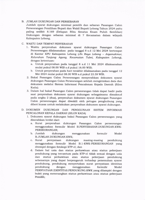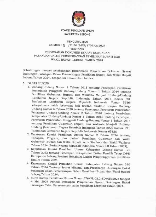 Pengumuman Penyerahan Dokumen Syarat Dukungan Pasangan Calon Perseorangan Pemilihan Bupati dan Wakil Bupati Kabupaten Lebong Tahun 2024