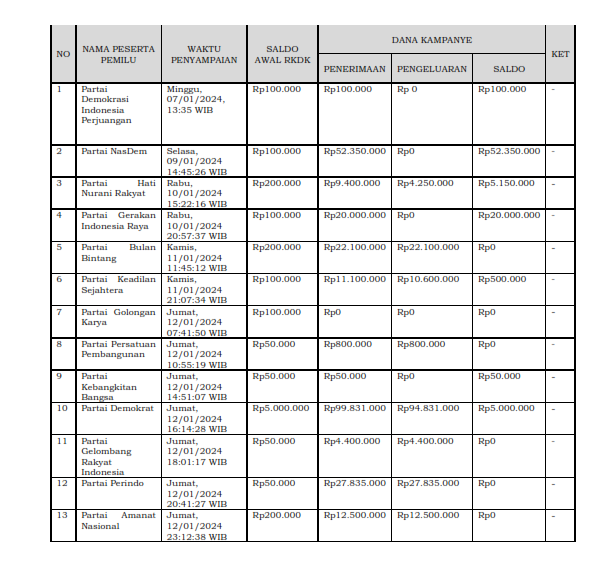 HASIL PENERIMAAN LAPORAN AWAL DANA KAMPANYE PERBAIKAN PESERTA PEMILIHAN UMUM TAHUN 2024