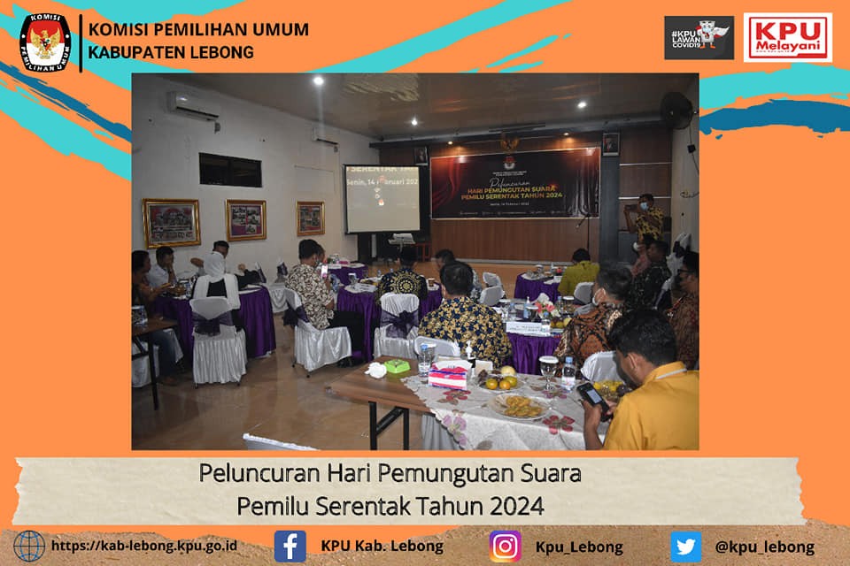 #TemanPemilih, Komisi Pemilihan Umum Kabupaten Lebong melaksanakan Acara Nonton Bersama Peluncuran Hari Pemungutan Suara Pemilihan Umum Serentak Tahun 2024 yang digelar secara daring oleh KPU Republik Indonesia pada Senin 14 Februari 2022 bertempat di Kantor KPU Kabupaten Lebong. Acara dihadiri oleh Bupati Lebong, Asisten I Setda Kabupaten Lebong, Bawaslu Kabupaten Lebong, Kejari Lebong, Kapolres Lebong, Dandim 0409 R/L yang Di Wakili Pabung Kodim 0409 R/L , Kesbangpol Kabupaten Lebong, Cabdin Diknas Provinsi Bengkulu Kabupaten Lebong dan Partai Politik Tingkat Kabupaten Lebong. Acara launching ini berlangsung dengan meriah dimulai dengan menyanyikan lagu Kebangsaan Indonesia Raya, sambutan Ketua KPU Republik Indonesia Ilham Saputra, serta puncak acara peluncuran Pemilu Serentak Tahun 2024 ditandai dengan pecoblosan Surat Suara oleh Ketua dan Anggota KPU Republik Indonesia.