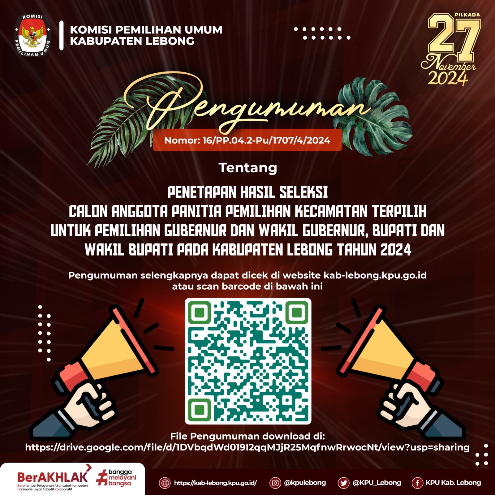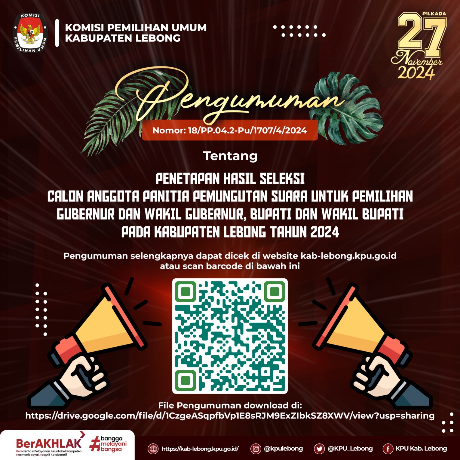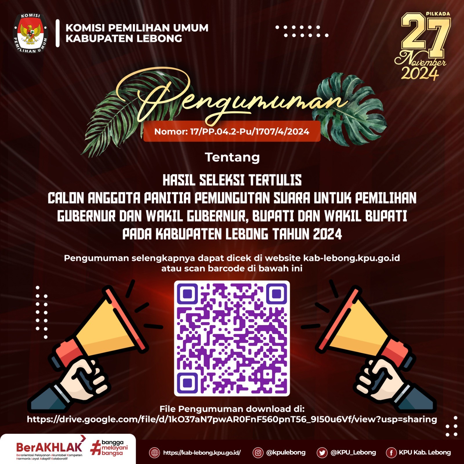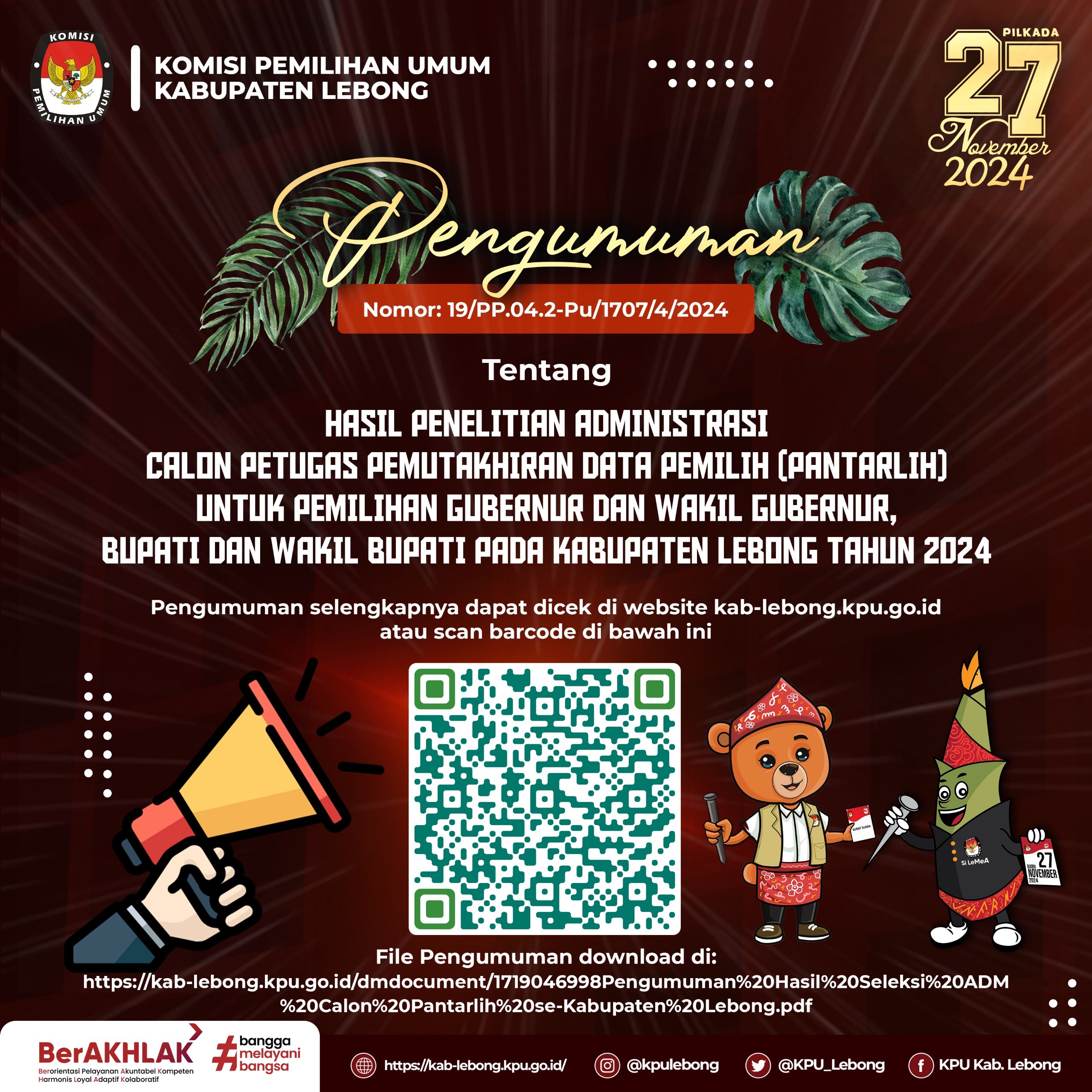 pengumuman selengkapnya dapat dibuka di website KPU Kabupaten Lebong atau klik link: https://kab-lebong.kpu.go.id/public/kab-lebong/dmdocument/1719046998Pengumuman%20Hasil%20Seleksi%20ADM%20Calon%20Pantarlih%20se-Kabupaten%20Lebong.pdf, terimakasih